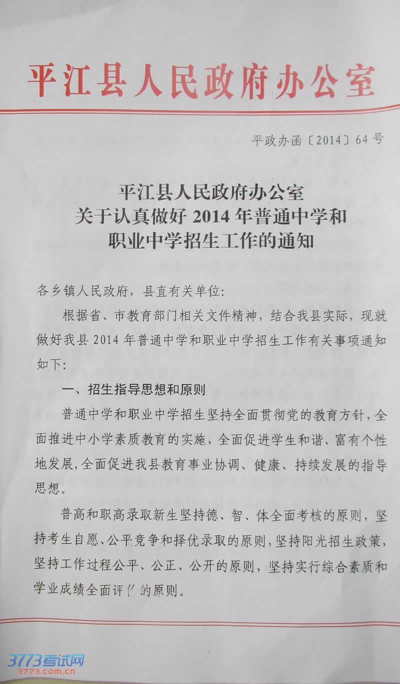 平江县人民政府办公室关于认真做好2014年普通中学和职业中学招生工作的通知