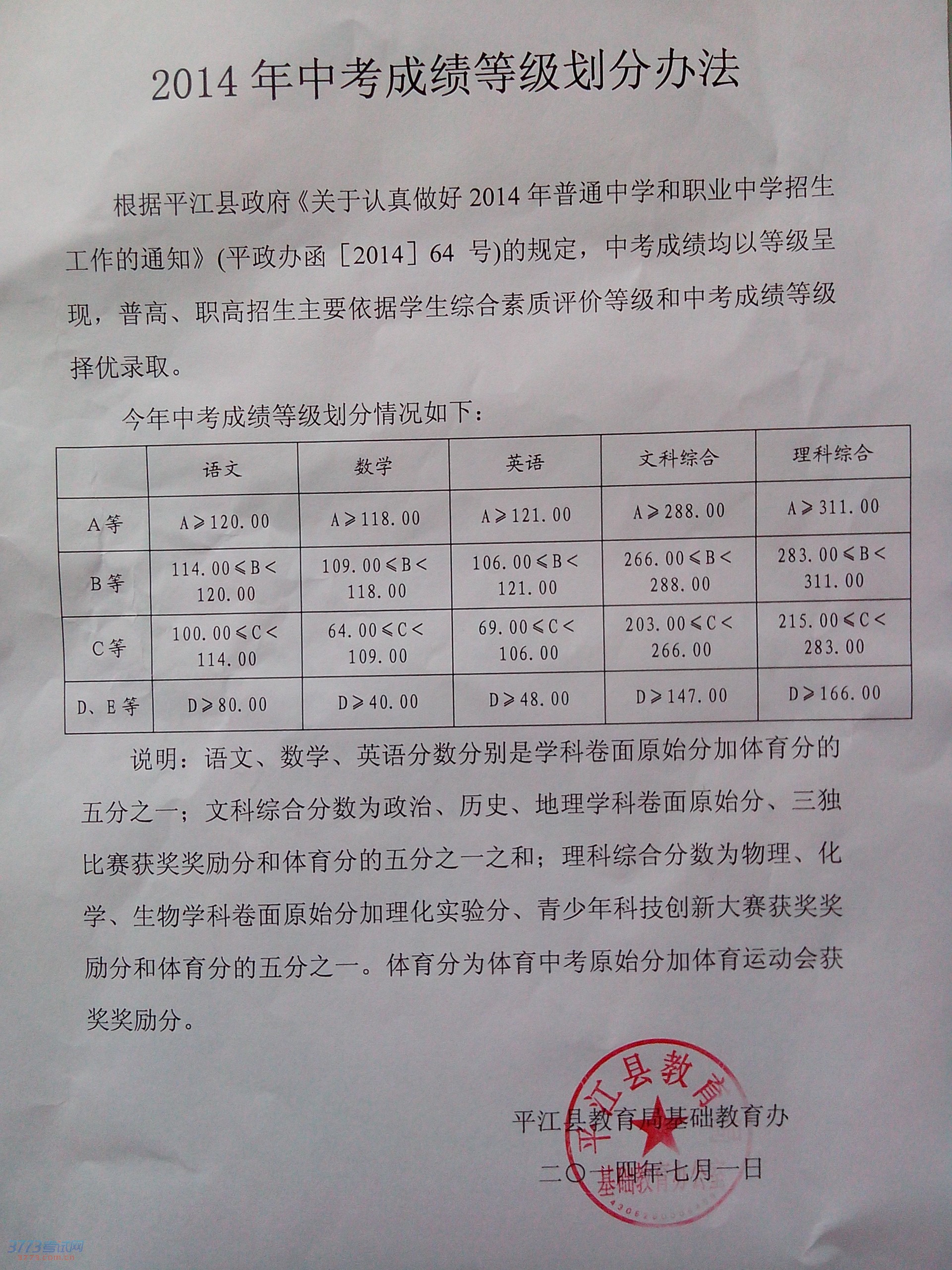 [图文]2014岳阳平江县中考成绩等级划分办法