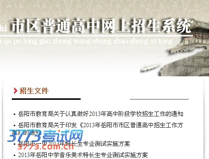 岳阳市教育局关于认真做好2013年高中阶段学校招生工作的通知 岳阳市教育局关于印发《2013年岳阳市市区普通高中招生工作方案》的通知 岳阳市一中2013年特长生专业测试实施方案 2013年岳阳中学音乐美术特长生专业测试实施方案 岳阳市第十四中学2013年专业特长生专业测试工作方案 岳阳市第十五中学2013年特长生考试方案 2013年岳阳市三中高中体育特长生专业测试方案 岳阳市第四中学2013年美术特长生专业测试方案 岳阳市第五中学宏志生招生方案 岳阳市第七中学2013年初三音乐艺术特长生测试方案学校简介