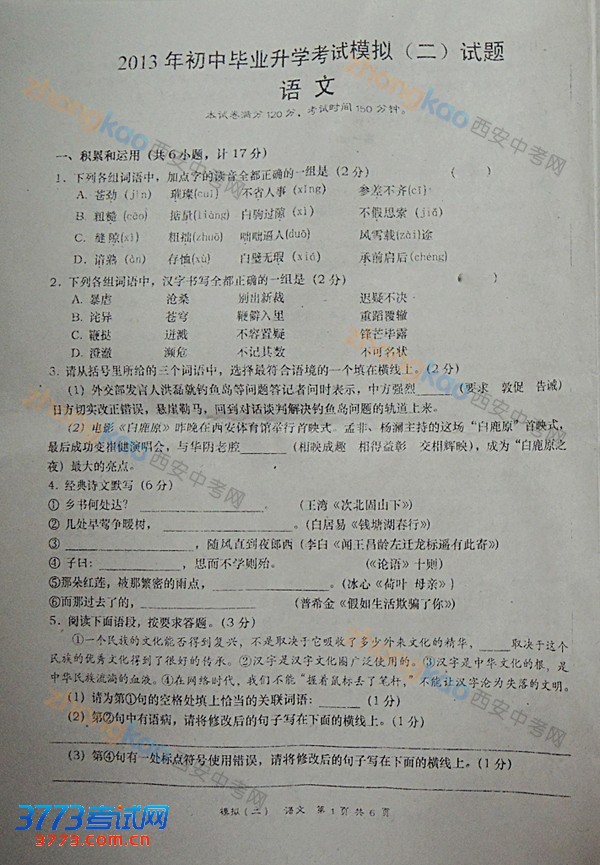[组图]2013西安高新一中中考语文模拟试题