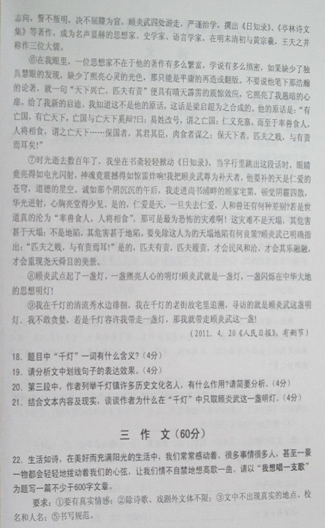 19.(4分)连设三问,体现了“我”对千灯文化的疑问和思考(2分);承上启下,引出对顾炎武这盏思想明灯的钟爱(2分)。