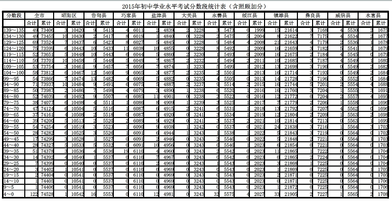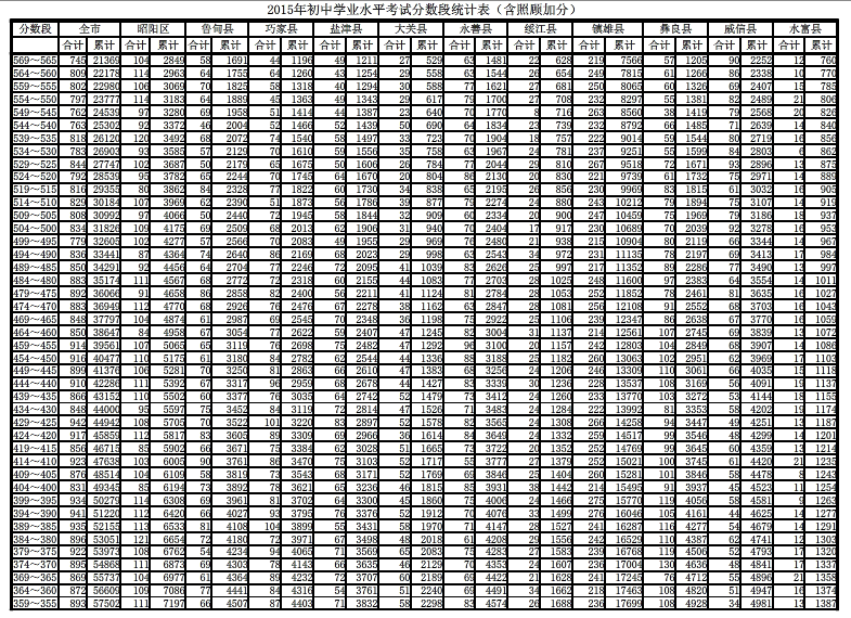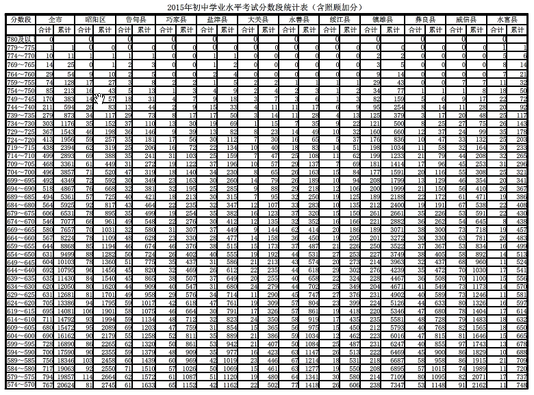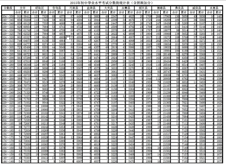 [组图]2015昭通中考分数段统计表(各县区含加分)