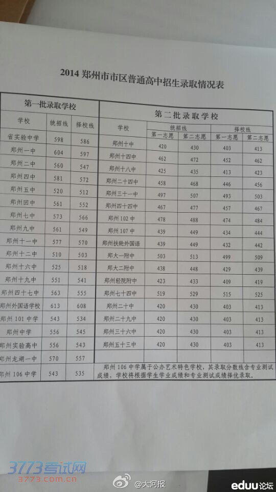 郑州106中学 统招生分数线:543;择校生分数线:535;