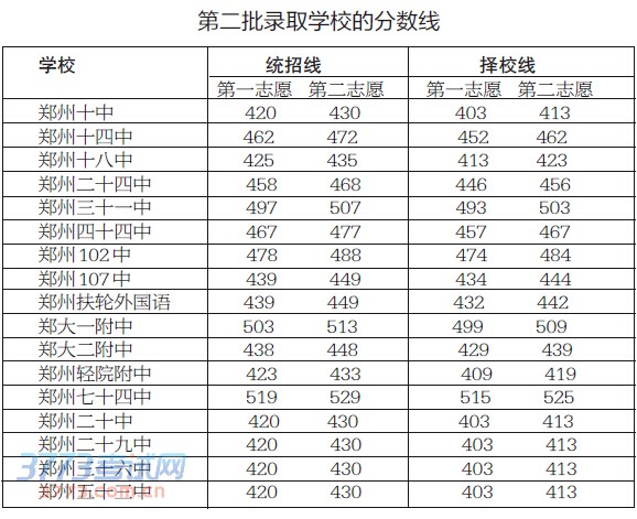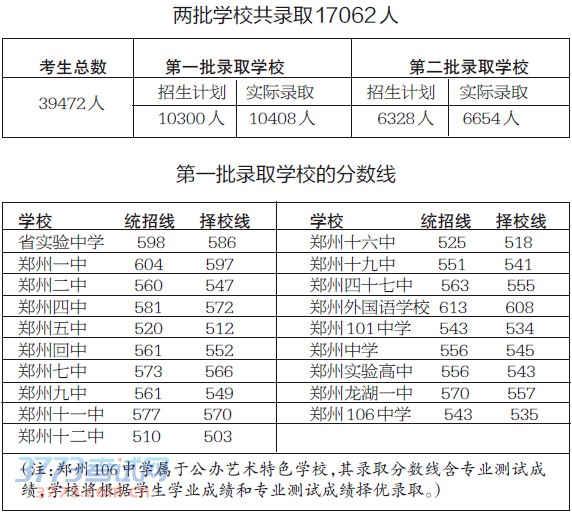 昨天,记者从郑州市教育局了解到,2014年郑州市区普通高中招生于今天正式开始录取。2014年郑州市区公办普通高中最低统招分数线为420分,最低择校分数线为403分。按照分数线,第一批、第二批录取学校共录取17062人,占总招生计划数的60%,占报名总数的43.2%。如果考虑后期民办学校的录取,今年预计录取人数将达到28870人,普通高中录取率将达到73.1%。