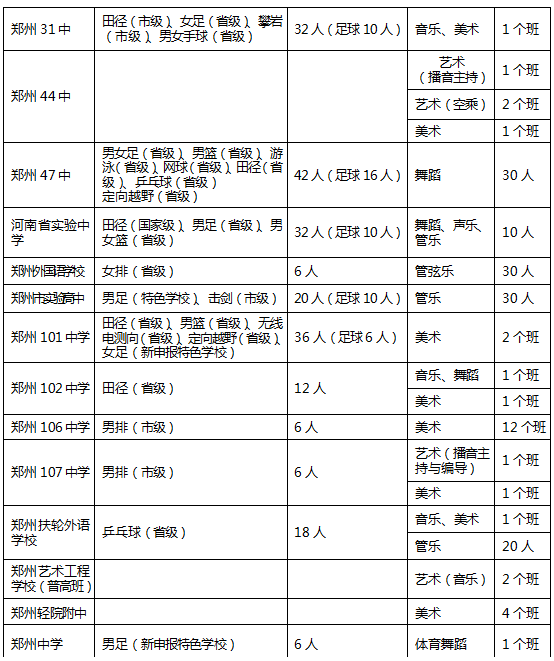 2016年郑州市市区普通高中体育尖子生、艺术特长生招生计划见下表(以郑州市教育局下达2016年招生计划为准)。