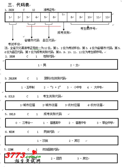 KSLB C 1 考生类别 1-城市应届 2-城市往届 3-农村应届 4-农村往届ZKZH C 12 文化课准考证号 由市地招办计算机随机编排