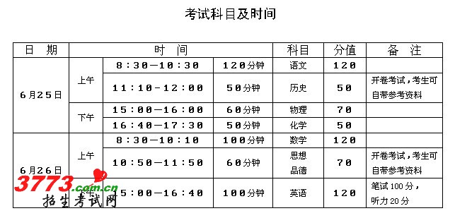 招收初中毕业生的普通中专文化课考试与全省初中毕业生统一升学考试一并进行,考试时间是6月25至26日。我市的普通中专考试科目与普通高中考试科目相同。体育成绩50分,物理、化学、生物实验操作考试成绩15分,文化课共七门600分,总分665分。