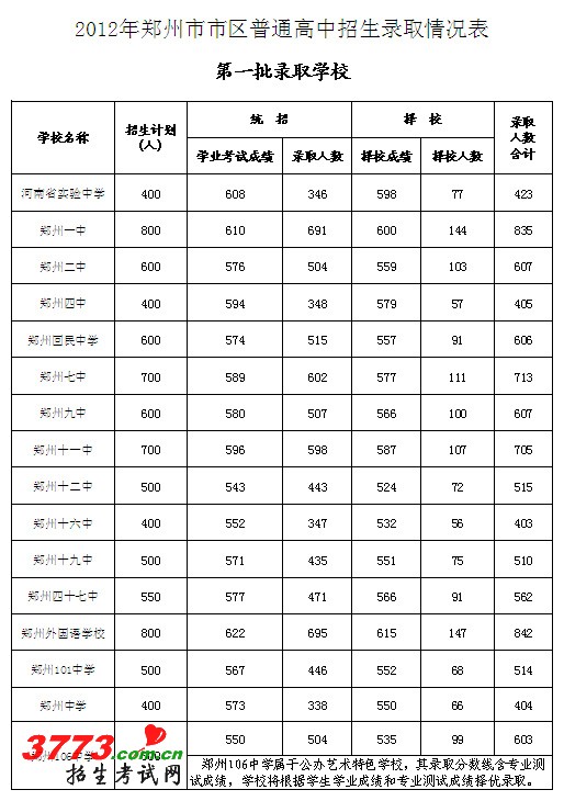 [组图]2012年郑州市市区普通高中招生录取情况表
