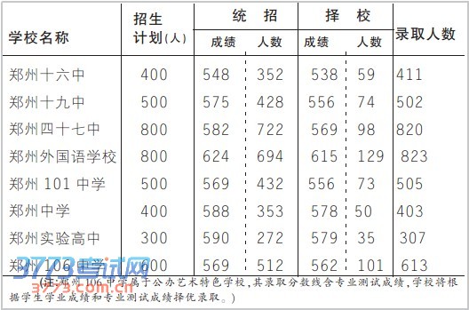 今年,郑州市的整体分数线普遍看涨。比如,今年,郑州外国语学校统招分数线为624分,市区最高,比去年的622分高了2分;郑州一中统招分数线为615分,比去年的610分提高5分;河南省实验中学统招分数线为614分,比去年的608分提高6分。今年,郑州市普通高中统招最低录取线为445分,比去年的435分提高10分。