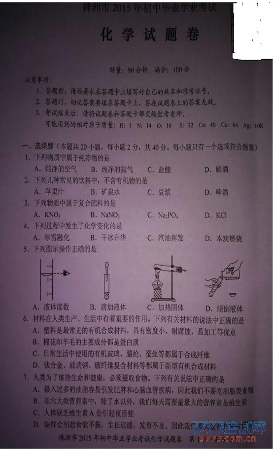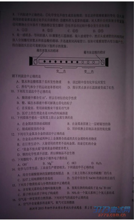 [组图]2015株洲中考化学试题卷发布