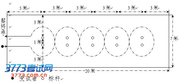 考试方法:受试者在起点线后持球站立,听到出发口令后,按图示路线用单手运球依次过杆(途中可换手),运球绕完所有标志杆后返回终点。发令员发令后开表计时,受试者与球均返回终(起)点线时停表。运球路线与《国家学生体质健康标准》所规定的“篮球运球”测试路线相同(见附图)。每名受试者测一次,以秒为单位,保留1位小数。