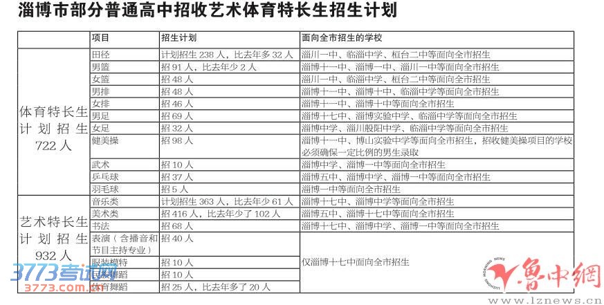淄博十七中、淄博实验中学、淄博五中、淄博十一中、淄博中学等淄博中心城区学校特长生招生计划数为469人,比去年少了83人。