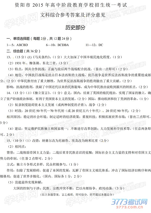 [组图]2015资阳中考历史试题及答案评分标准发布