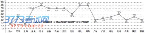 分配比例差异较大从各地情况看,以省(市、区)级示范性高中学校为单位,各地用于指标分配的比例差异较大,大部分地方不低于40%、50%,河北、湖北、湖南等省规定省级示范性普通高中直接分配到区域内初中学校的指标生比例不低于80%。但也有一些地区比例还比较低,还有个别地方因为种种原因,这一政策仍在规划之中尚未正式启动实施。广州市2013年制定方案,三年过渡,2016年具体实施,2016-2018年,指标分配的比例为30%。其中省市属示范性普通高中指标生计划面向全市分配,区(县市)属示范性普通高中指标生计划面向本区(县市)分配。