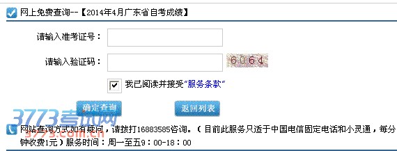 网上免费查询--【2014年4月广东省自考成绩】请输入准考证号: 请输入验证码: 我已阅读并接受"服务条款" 网站查询方式如有疑问,请拨打16883585咨询。(目前此服务只适于中国电信固定电话和小灵通,每分钟收费1元)服务时间:周一至五9:00-18:00