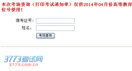 本次考场查询(打印考试通知单)仅供2014年04月份高等教育自学考试网上报名考生查询考场和座位号使用!