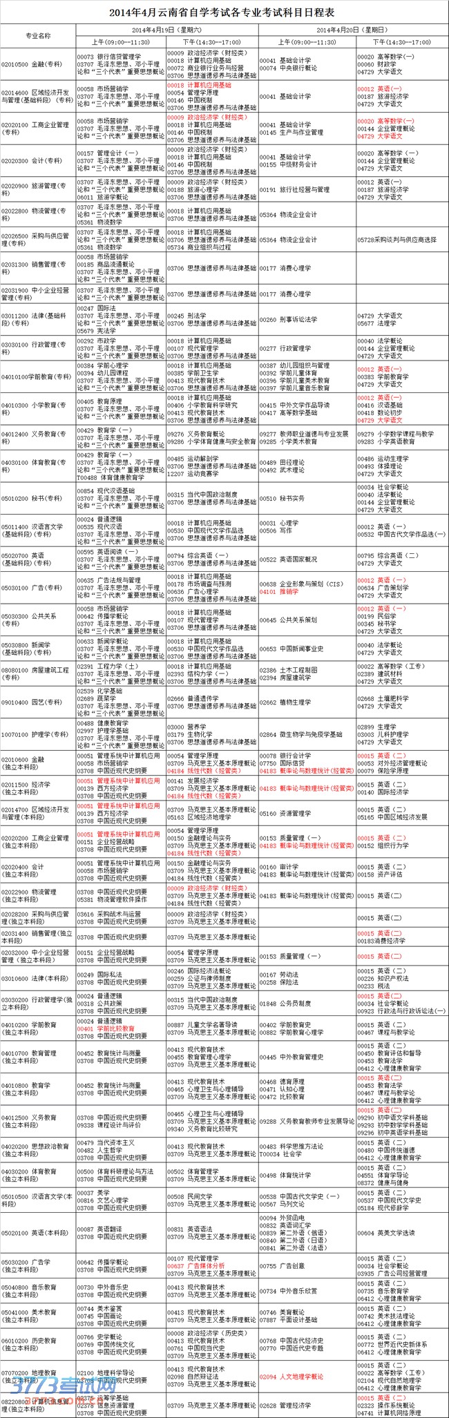 [图文]2014年4月云南自学考试各专业考试科目日程表
