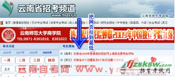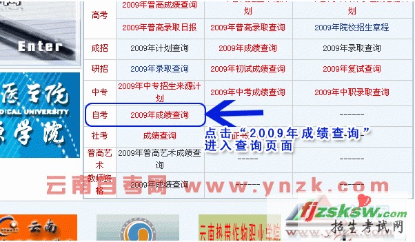 第二步:把打开的网页拉到最底,找到“自考 2009年成绩查询”红字,并点击“2009年成绩查询”进入查分页面。(如下图)