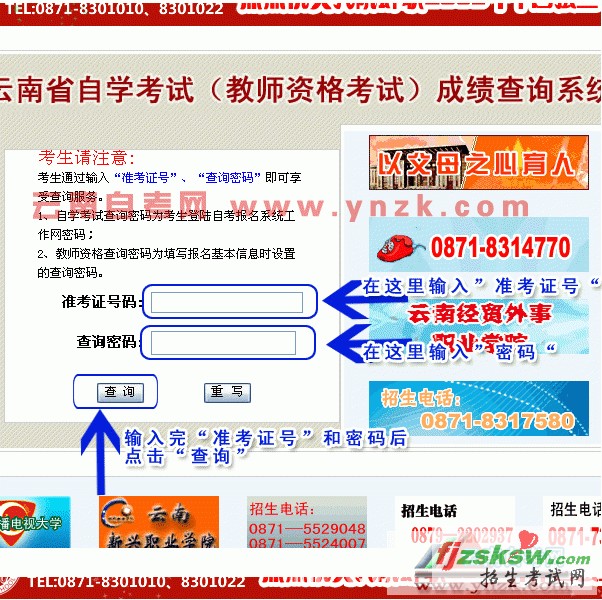 第三步:进入查分页面后,在“准考证号码”和“查询密码”输入框中分别输入你自己的准考证号码和查询密码,然后点击“查询”按钮进行查分操作。(如下图)