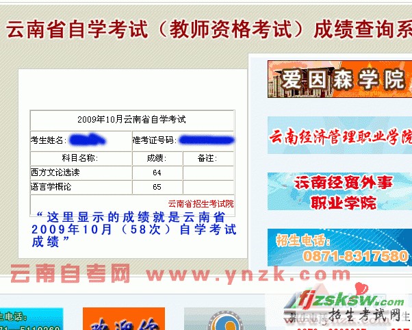第四步:进入分数显示页面后便可以看到你在“2009年10月(58次)云南自学考试的成绩”。(如下图)