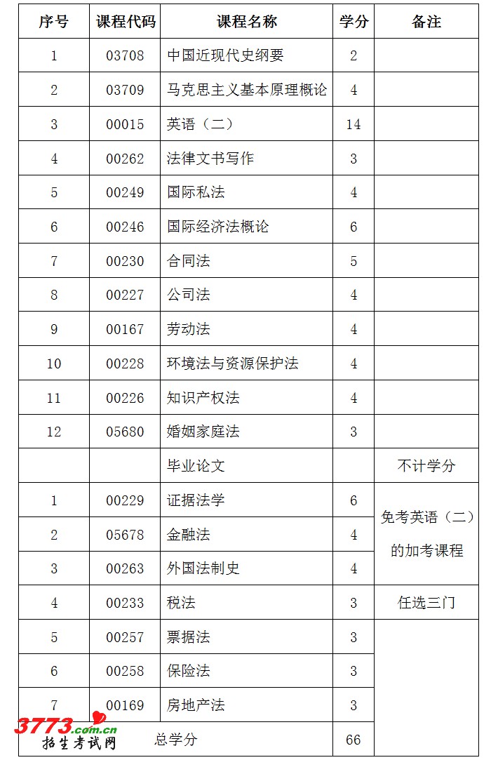 4、申请免考英语(二)的考生,加考课程为证据法学、金融法、外国法制史三门课程,学分不少于14学分;