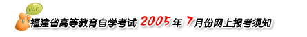 2005年7月份自考全部实行网上报名,现场不另设报名点。全省考生均可通过福建省高等教育自学考试网络电子报考系统网上报名并在线支付。网络报考系统开通时间: 2005年4月28日-5月31日 。 |