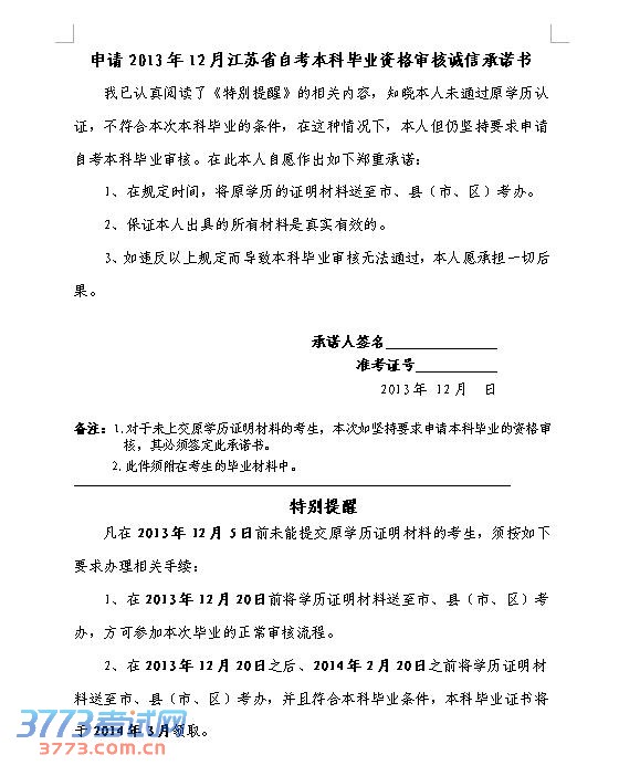 答:凡在2013年12月5日前未能提交原学历证明材料的考生,须在报名现场签定《申请2013年12月江苏省自考本科毕业资格审核诚信承诺书》(样表见附件3),并按如下要求办理相关手续: