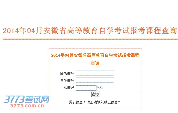 2014年04月安徽省高等教育自学考试报考课程查询 2014年04月安徽省高等教育自学考试报考课程查询准考证号:身份证号:验证码:7454